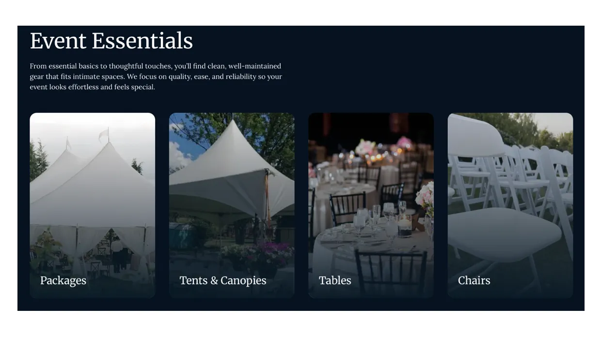 Start by exploring our wide range of event essentials right from our homepage or by searching our catalog. Filter by category (like Tents & Canopies, Tables, or Packages) or search by event type. Not sure what you need? Select Contact Us and send us an email with your thoughts!